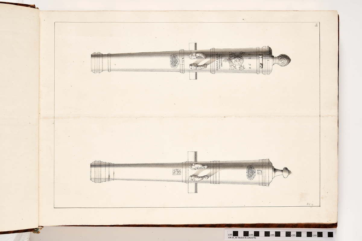 Avbildning föreställande eldrör tagna som troféer av den svenska armén i slaget vid Saladen den 19 mars 1703. Ingår i volym med avbildade kanontroféer tagna åren 1703-1706.