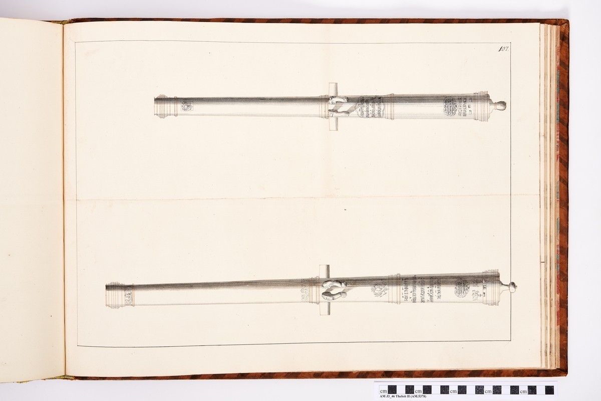 Avbildning föreställande eldrör tagna som troféer av den svenska armén vid Thulendorf den 29 november 1704. Ingår i volym med avbildade kanontroféer tagna åren 1703-1706.