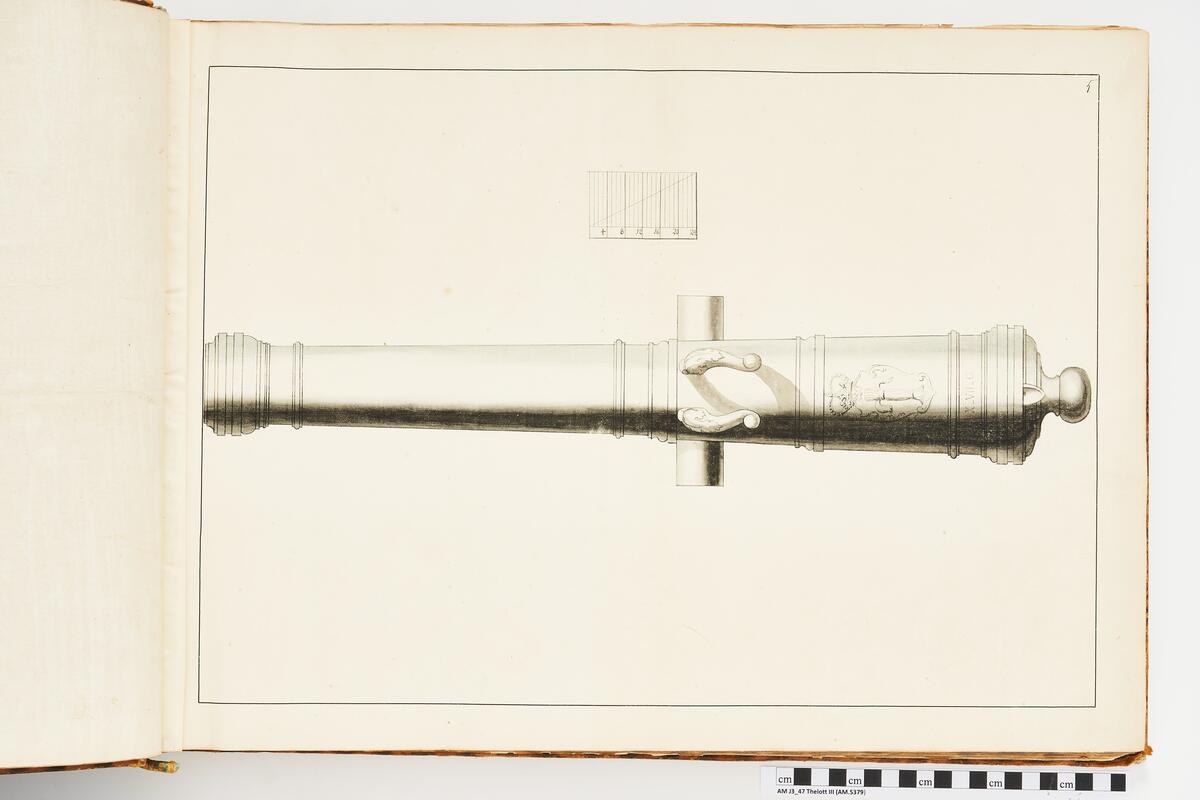 Avbildning föreställande gammalt svenskt metallstycke som legat på rikets fästningar, med Vasaättens vapen. Ingår i volym med avbildade äldre svenska eldrör förvarade på fästningar samt eldrör erövrade åren 1598-1679.