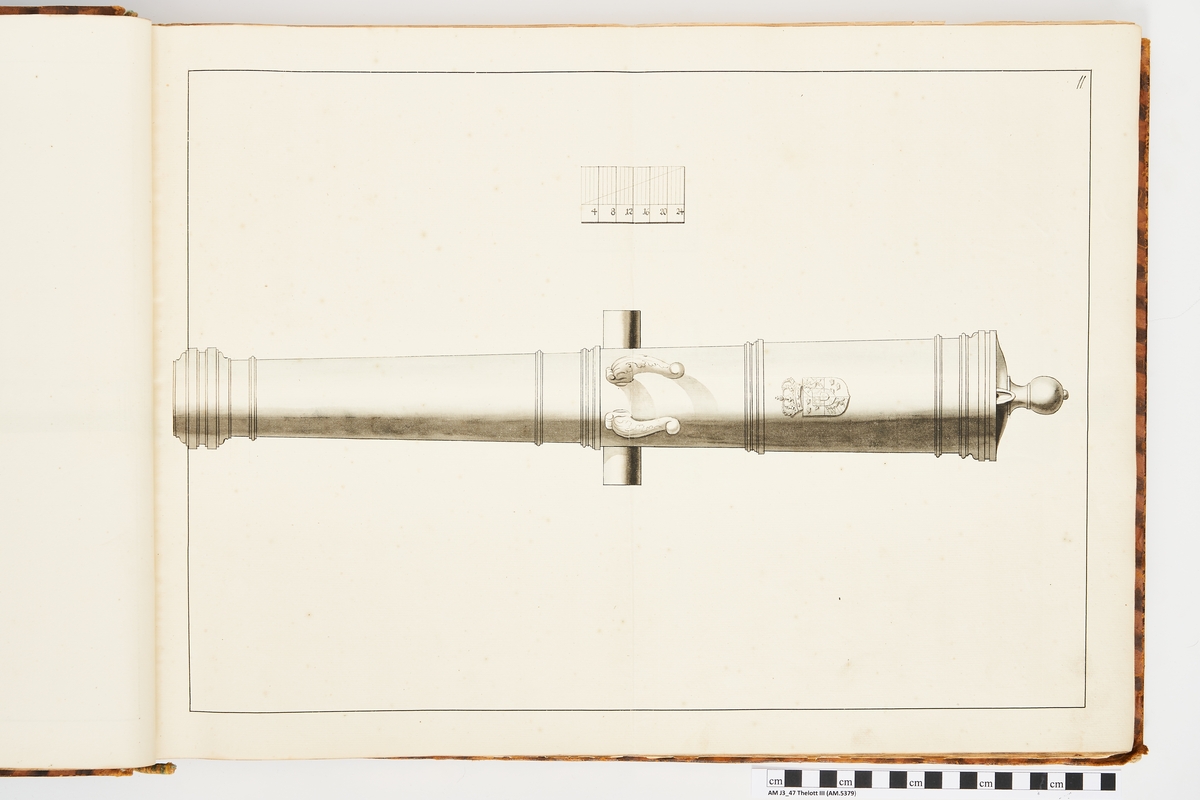 Avbildning föreställande gammalt svenskt metallstycke som legat på rikets fästningar, med Vasaättens vapen. Ingår i volym med avbildade äldre svenska eldrör förvarade på fästningar samt eldrör erövrade åren 1598-1679.