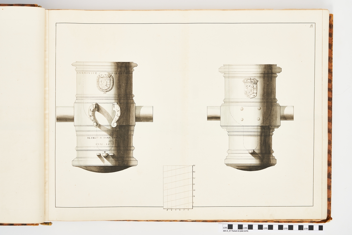 Avbildning föreställande gamla metallstycken som legat på rikets fästningar, med Vasaättens vapen (höger). Ingår i volym med avbildade äldre svenska eldrör förvarade på fästningar samt eldrör erövrade åren 1598-1679.