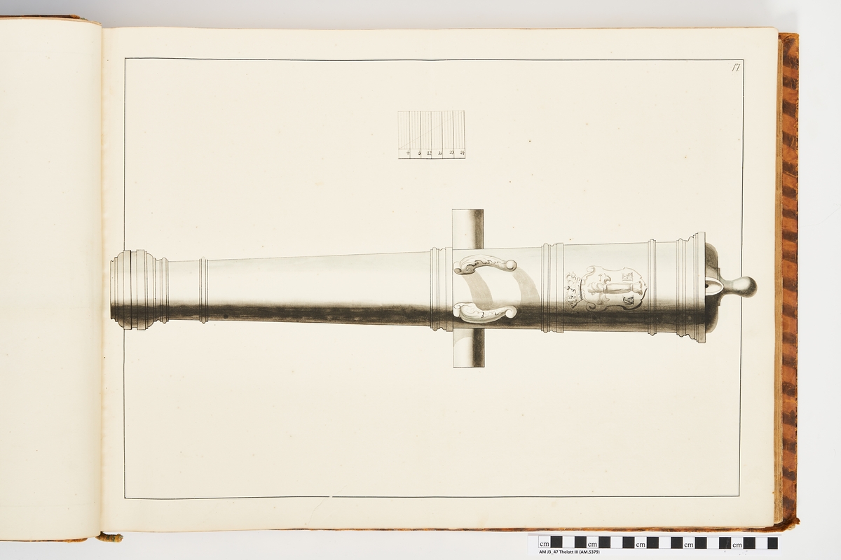 Avbildning föreställande gammalt svenskt metallstycke som legat på rikets fästningar, med Vasaättens vapen och bokstäverna GARS. Ingår i volym med avbildade äldre svenska eldrör förvarade på fästningar samt eldrör erövrade åren 1598-1679.