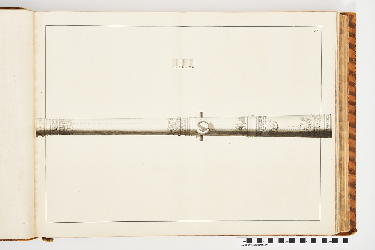 Avbildning föreställande gammalt metallstycke som legat på rikets fästningar, gjuten i Stralsund och med Stralsunds vapen. Ingår i volym med avbildade äldre svenska eldrör förvarade på fästningar samt eldrör erövrade åren 1598-1679.