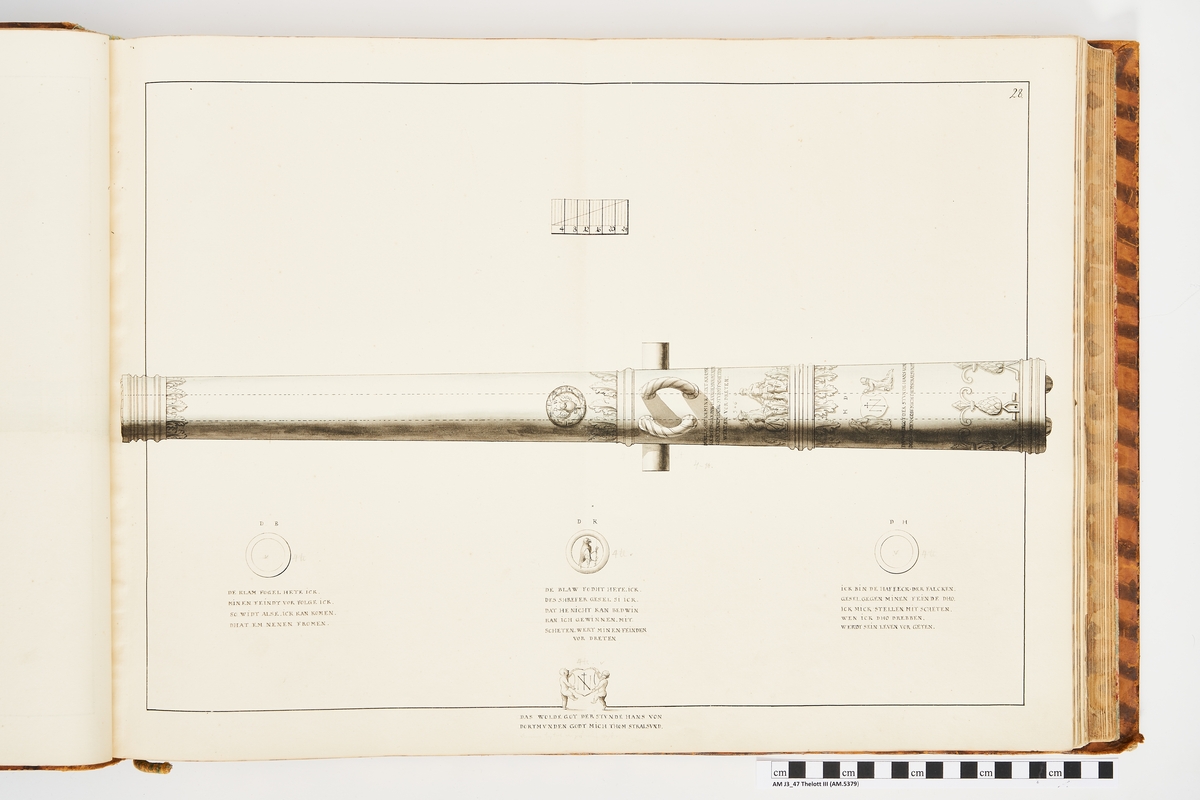 Avbildning föreställande gammalt metallstycke som legat på rikets fästningar, gjuten i Stralsund och med Stralsunds vapen. Ingår i volym med avbildade äldre svenska eldrör förvarade på fästningar samt eldrör erövrade åren 1598-1679.
