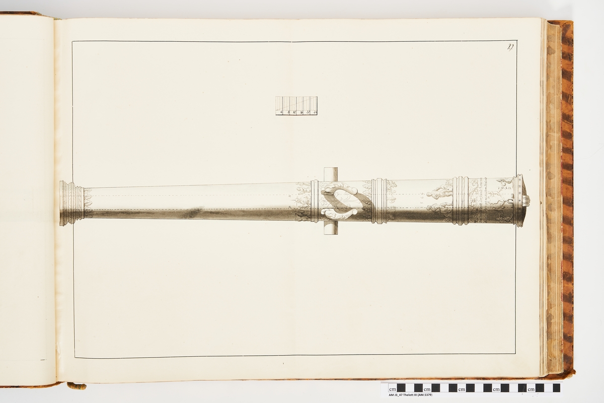 Avbildning föreställande gammalt metallstycke som legat på rikets fästningar, gjuten i Stralsund och med Stralsunds vapen. Ingår i volym med avbildade äldre svenska eldrör förvarade på fästningar samt eldrör erövrade åren 1598-1679.
