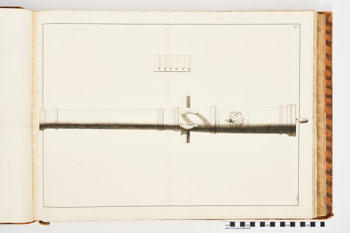Titel: Avbildning föreställande gammalt metallstycke som legat på rikets fästningar, gjuten i Stralsund och med Stralsunds vapen. Ingår i volym med avbildade äldre svenska eldrör förvarade på fästningar samt eldrör erövrade åren 1598-1679.