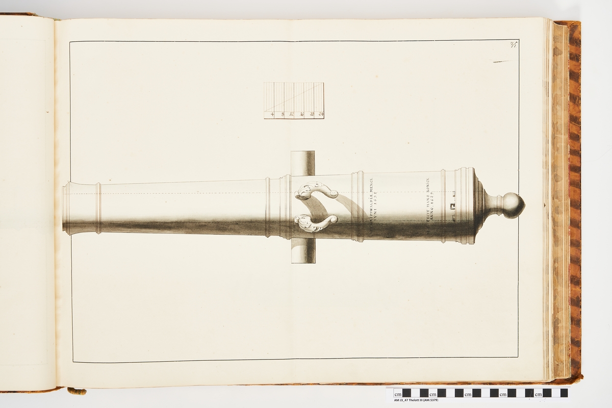 Avbildning föreställande gammalt metallstycke som legat på rikets fästningar, gjuten i Greifswald och med Greifswalds vapen. Ingår i volym med avbildade äldre svenska eldrör förvarade på fästningar samt eldrör erövrade åren 1598-1679.
