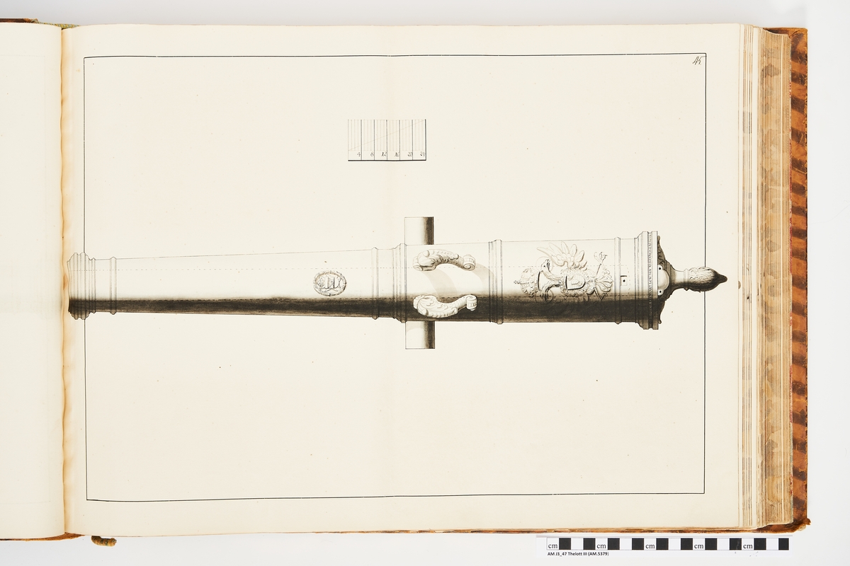 Avbildning föreställande romersk kejserlig trofé med kejsar Ferdinand III:s vapen. Ingår i volym med avbildade äldre svenska eldrör förvarade på fästningar samt eldrör erövrade åren 1598-1679.