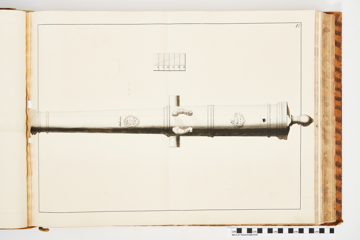 Avbildning föreställande romersk kejserlig trofé med kejsar Ferdinand III:s vapen. Ingår i volym med avbildade äldre svenska eldrör förvarade på fästningar samt eldrör erövrade åren 1598-1679.