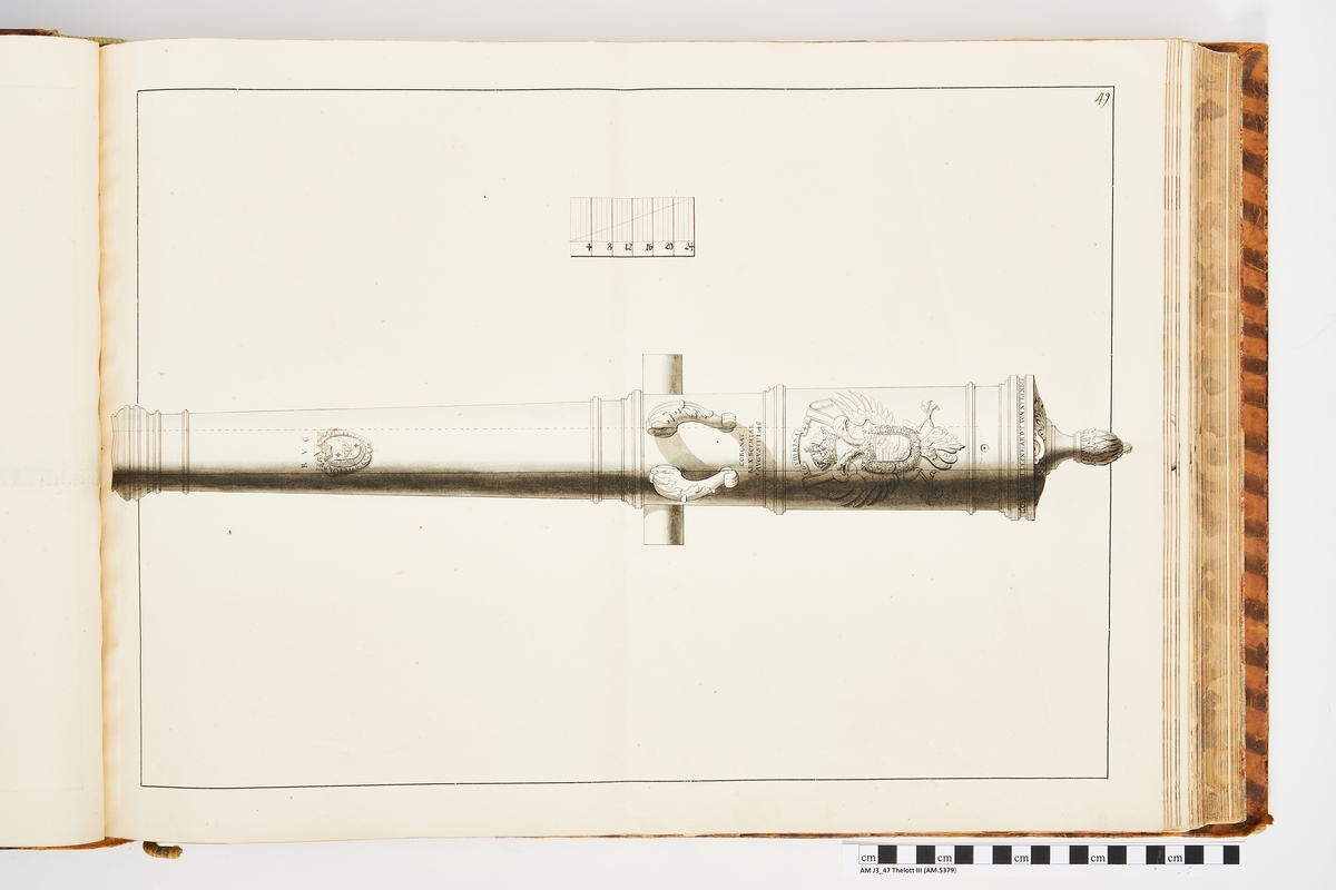 Avbildning föreställande romersk kejserlig trofé med kejsar Ferdinand III:s vapen. Ingår i volym med avbildade äldre svenska eldrör förvarade på fästningar samt eldrör erövrade åren 1598-1679.