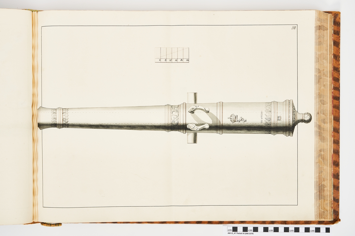 Avbildning föreställande dansk trofé med Frederik III:s vapen. Ingår i volym med avbildade äldre svenska eldrör förvarade på fästningar samt eldrör erövrade åren 1598-1679.