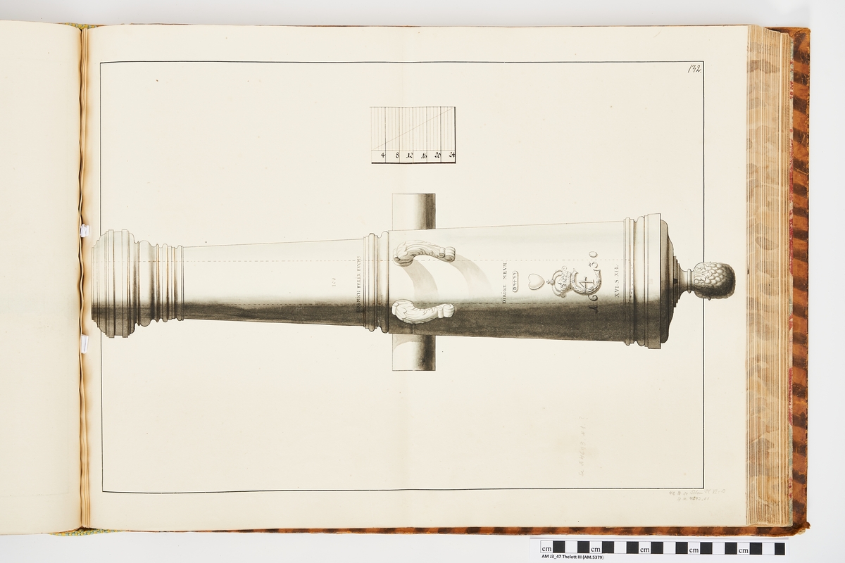 Titel: Avbildning föreställande dansk trofé med Kristian IV:s vapen. Ingår i volym med avbildade äldre svenska eldrör förvarade på fästningar samt eldrör erövrade åren 1598-1679.