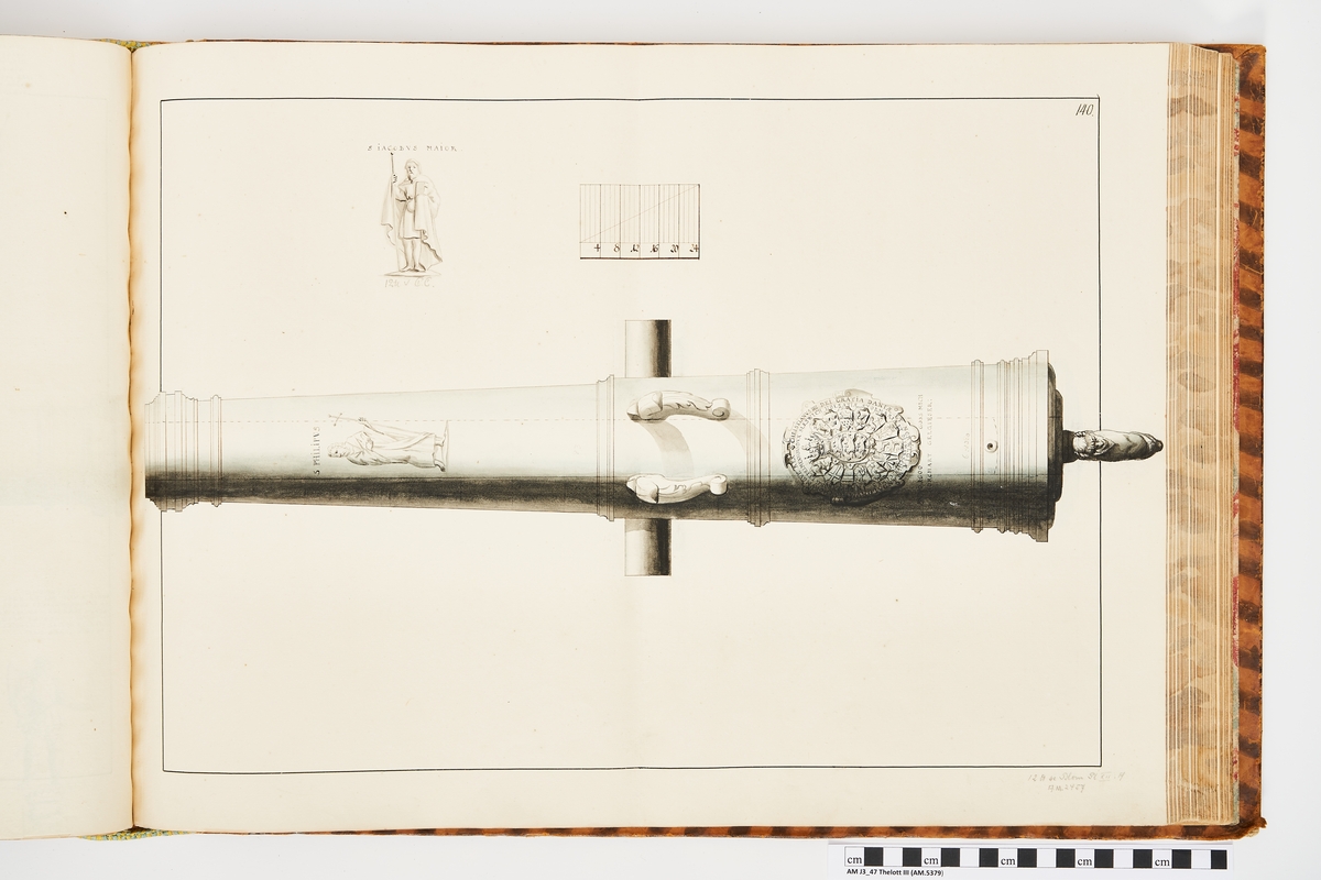Titel: Avbildning föreställande dansk trofé med Kristian IV:s vapen. Ingår i volym med avbildade äldre svenska eldrör förvarade på fästningar samt eldrör erövrade åren 1598-1679.