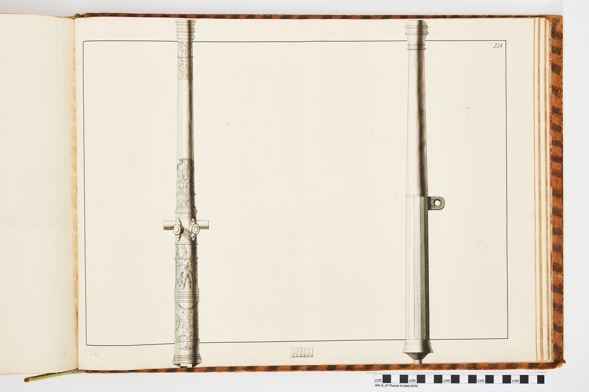 Avbildning föreställande troféer av okänd nationalitet. Ingår i volym med avbildade äldre svenska eldrör förvarade på fästningar samt eldrör erövrade åren 1598-1679.