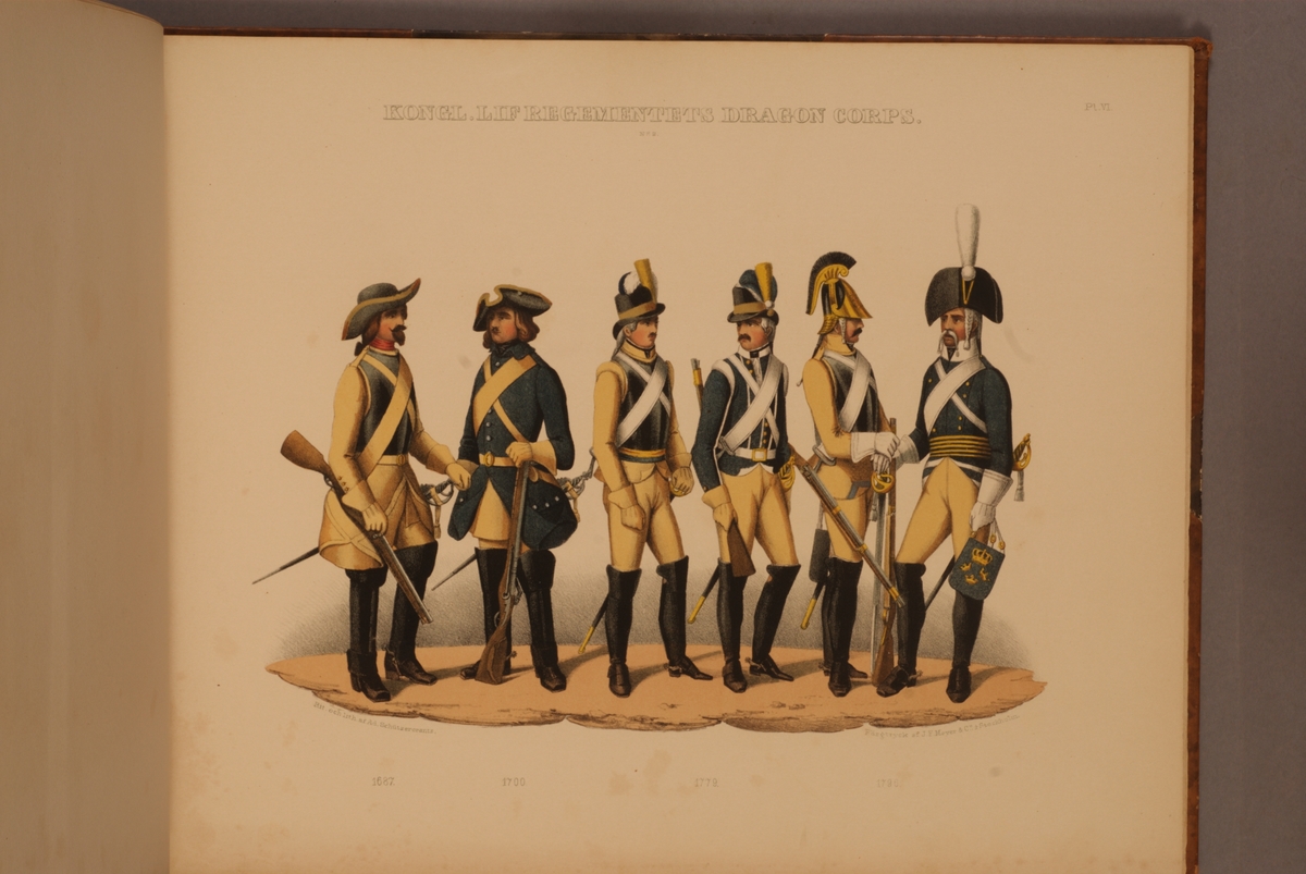 Plansch med uniform för Livregementets dragonkår för åren 1687-1796. Plansch i färgtryck efter original av Adolf Ulrik Schützercrantz. Ingår i planschsamlingen Svenska krigsmaktens fordna och närvarande munderingar.
