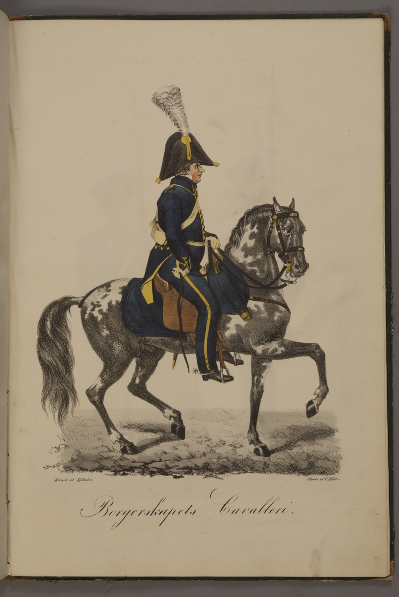 Plansch med uniform för Borgerskapets kavalleri. Plansch i färgtryck efter original av Johan Henric Sjöholm. Ingår i planschsamlingen Kongliga svenska arméens uniformer utgiven som stentryck av Müller 1825.