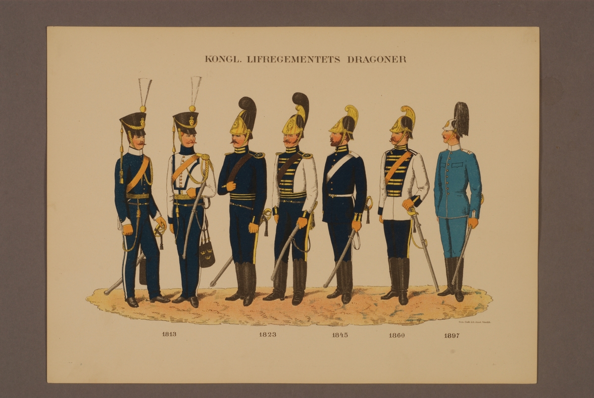 Plansch i färgtryck med uniform för Kungliga Livregementets dragoner för åren 1813-1897. Ingår i planschsamlingen Svenska krigsmaktens fordna och nuvarande munderingar utgiven av P.B Eklund 1900-1905.