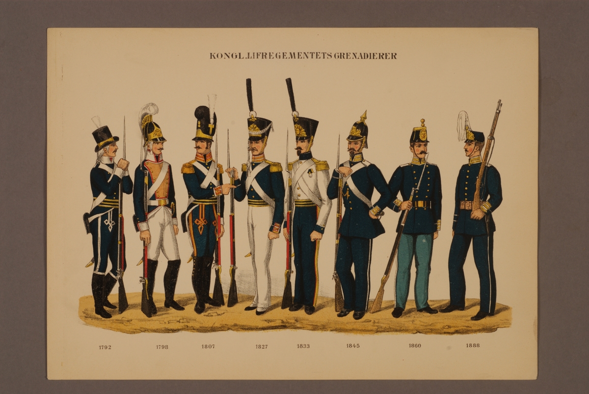 Plansch i färgtryck med uniform för Livregementets grendjärer för åren 1792-1888. Ingår i planschsamlingen Svenska krigsmaktens fordna och nuvarande munderingar utgiven av P.B Eklund 1900-1905.