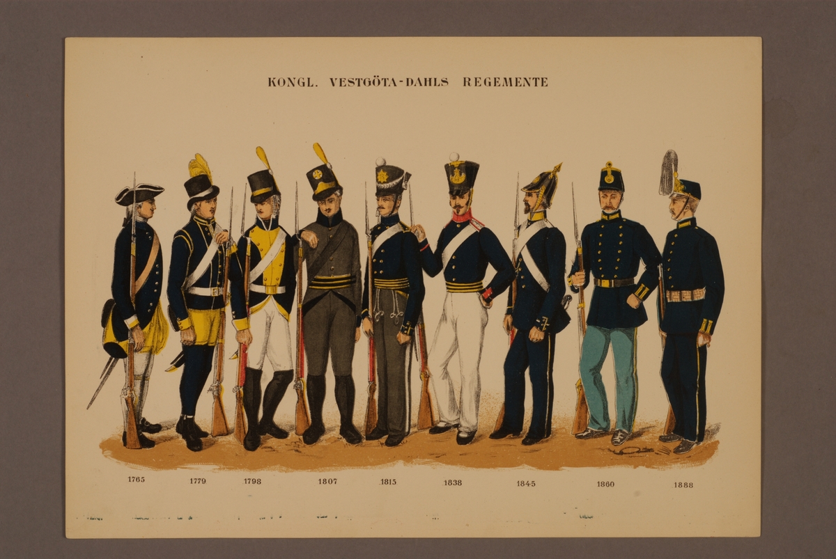 Plansch i färgtryck med uniform för Västgöta-Dals regemente för åren 1765-1888. Ingår i planschsamlingen Svenska krigsmaktens fordna och nuvarande munderingar utgiven av P.B Eklund 1900-1905.