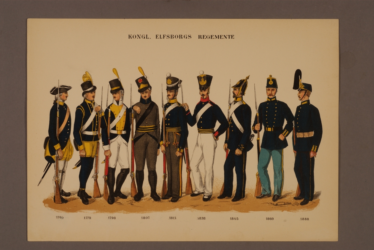 Plansch i färgtryck med uniform för Älvsborgs regemente för åren 1765-1888. Ingår i planschsamlingen Svenska krigsmaktens fordna och nuvarande munderingar utgiven av P.B Eklund 1900-1905.