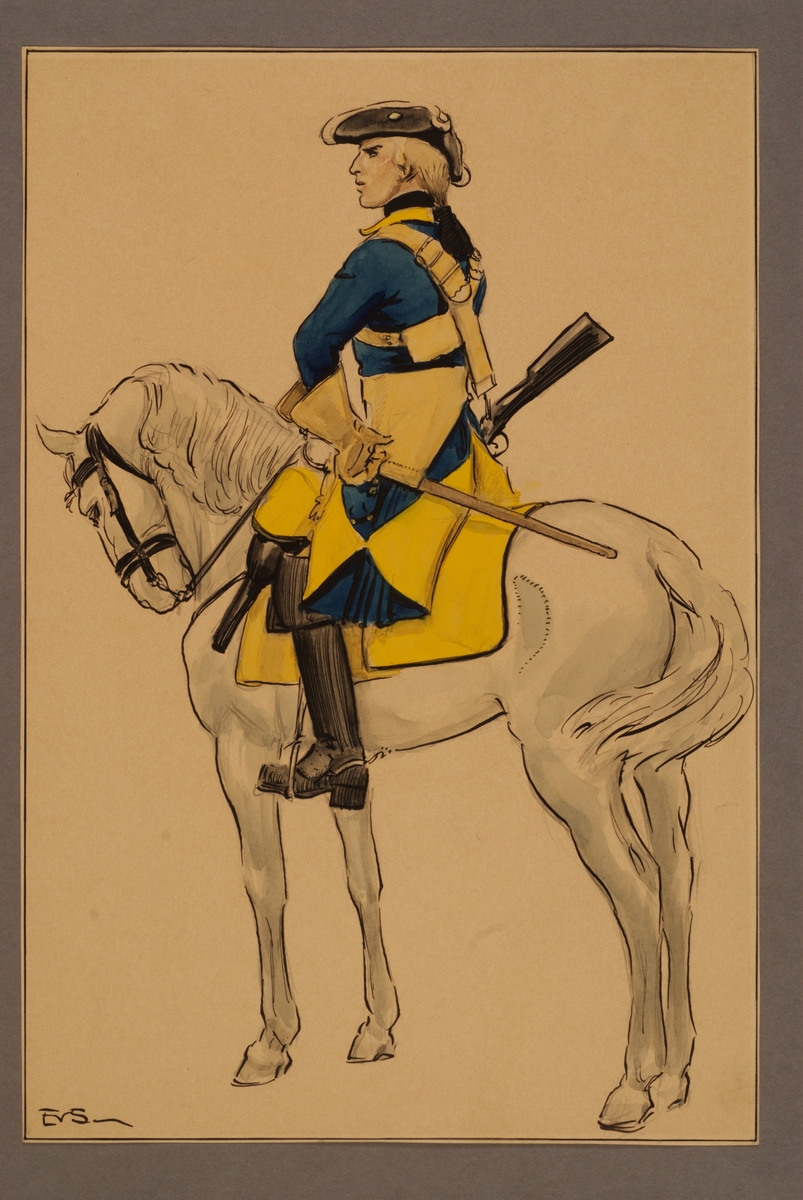 Plansch med uniform för ryttare vid Västgöta kavalleriregemente 1700-tal, ritad av Einar von Strokirch.