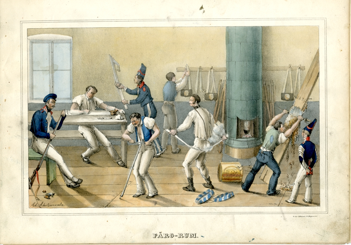 Soldater i färgrummet. Litografi i färgtryck efter original av Adolf Ulrik Schützercrantz. Ingår i planschsamlingen Scener ur soldatlivet.