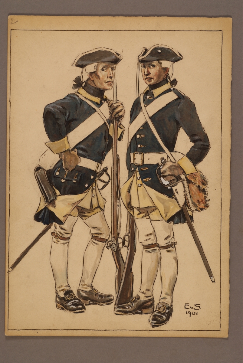 Plansch med uniform för grenadjärer vid Indelta linjeinfanteriet 1756, ritad av Einar von Strokirch.