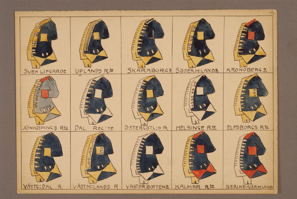 Plansch med schema för uniformering för svenska infanteriet, ritad av Einar von Strokirch.
