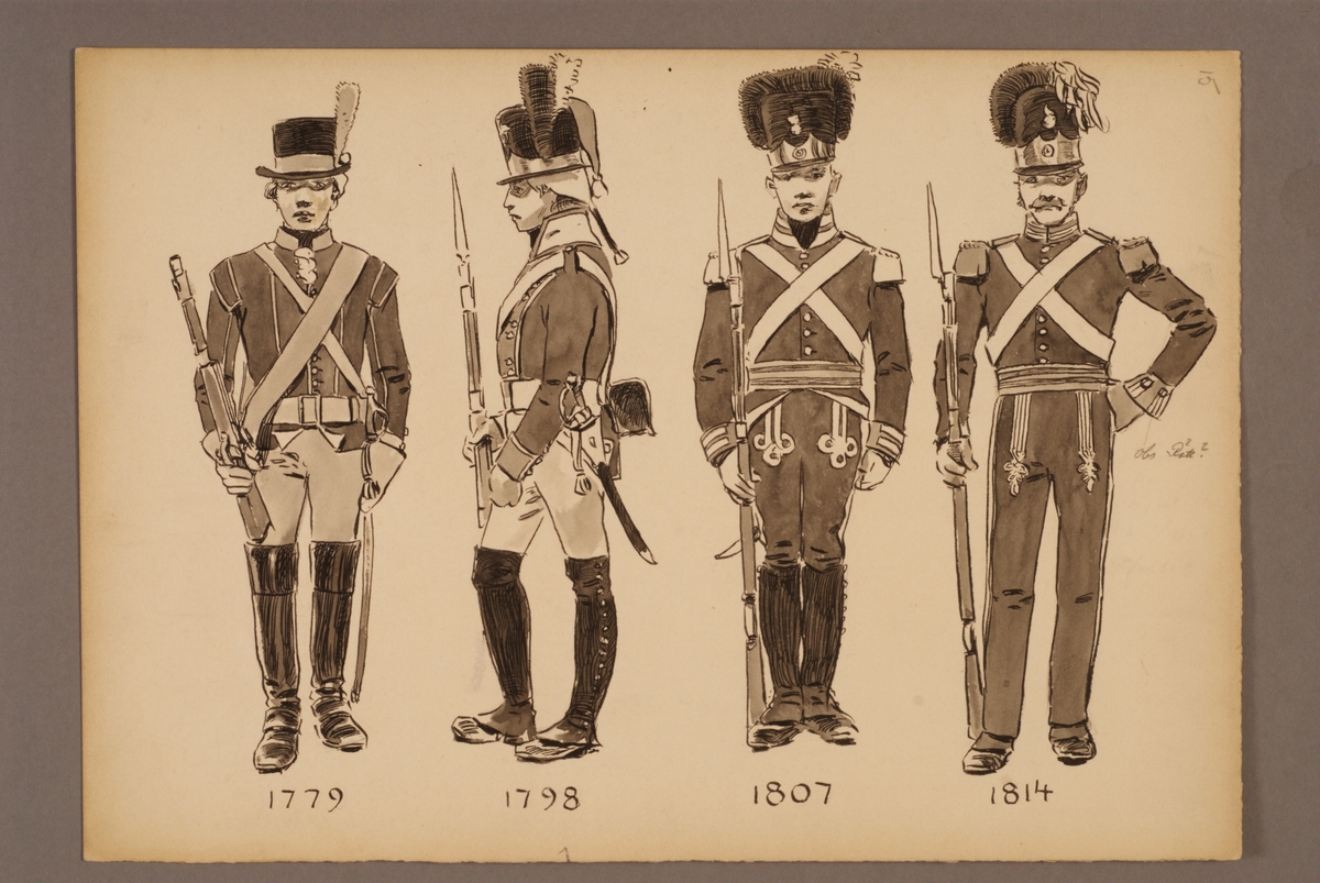 Plansch med uniform för Andra livgrenadjärregementet för åren 1779-1814, ritad av Einar von Strokirch.