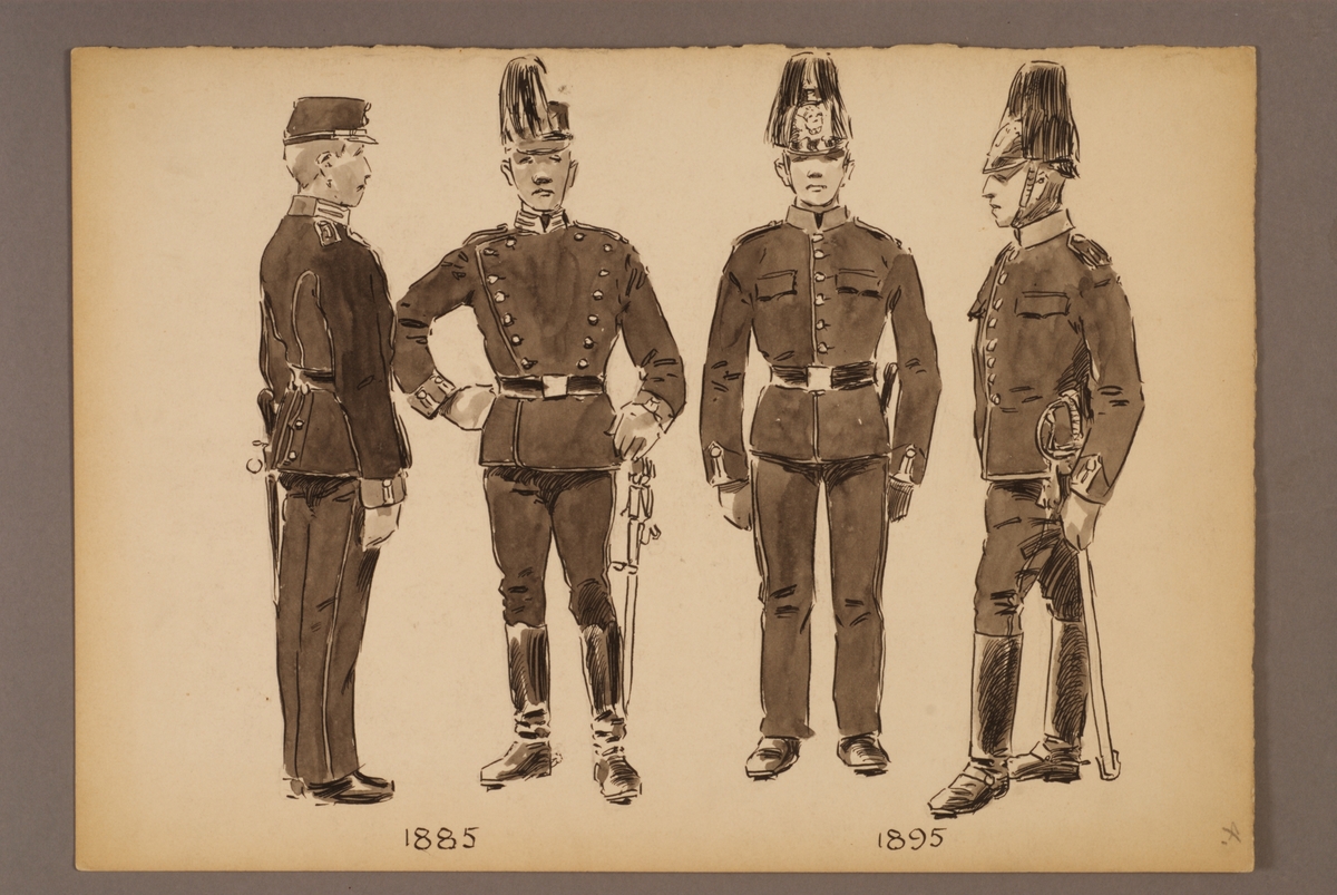 Plansch med uniform för Trängen för åren 1885 och 1895, ritad av Einar von Strokirch.