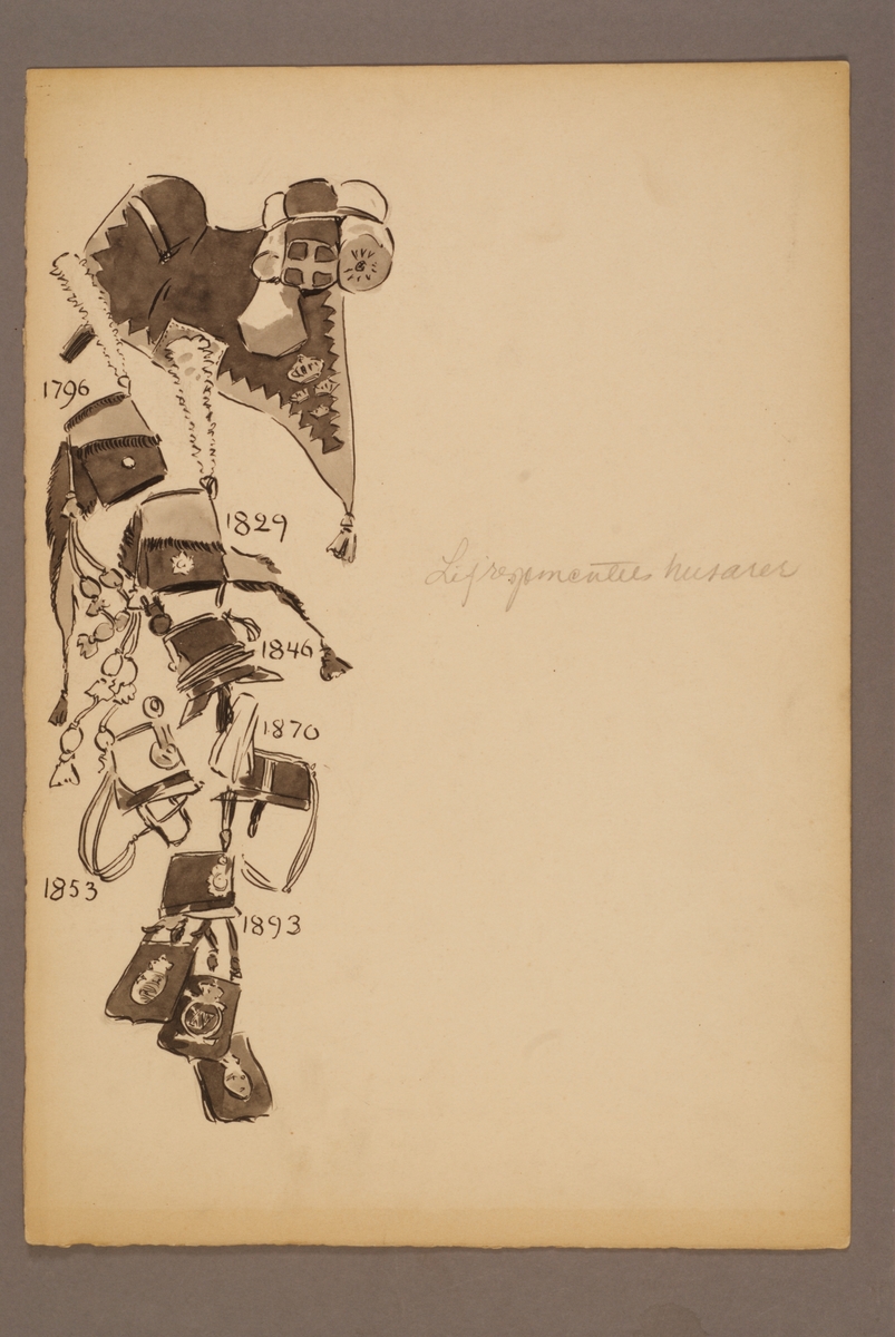 Plansch med huvudbonader, väskor och sadel för Livregementets husarer, ritad av Einar von Strokirch.