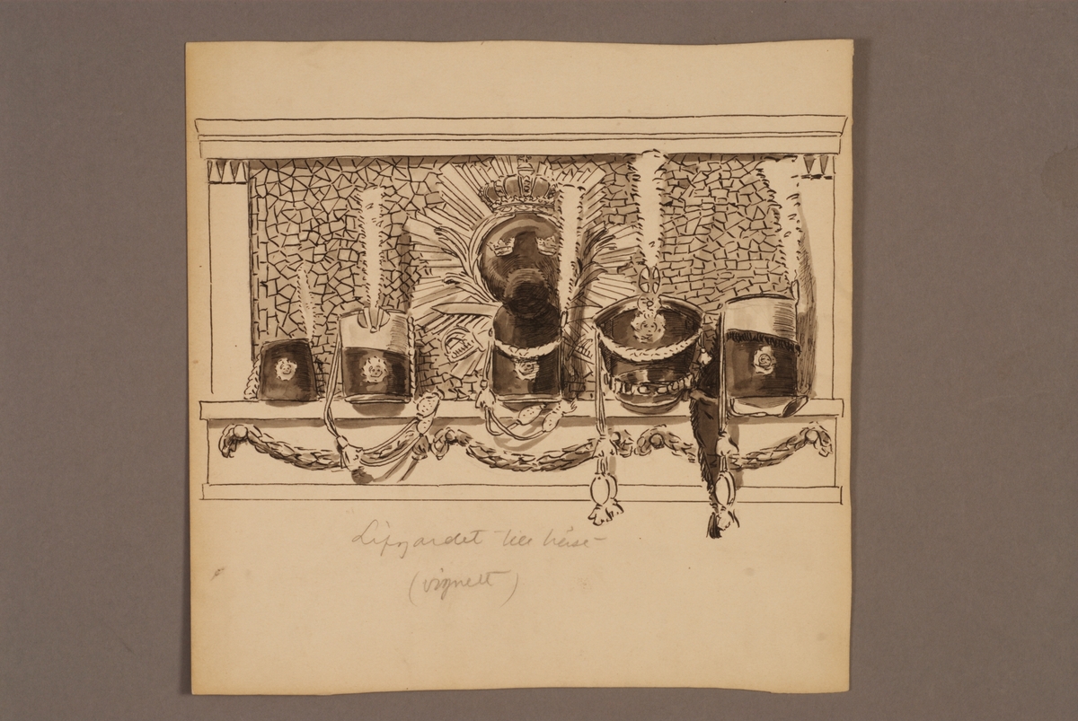 Plansch med huvudbonader för Livgardet till häst, ritad av Einar von Strokirch.