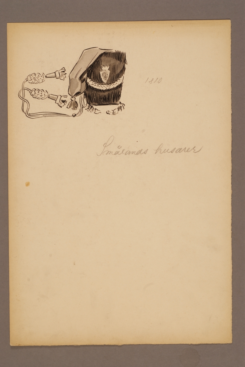 Plansch med huvudbonader för Smålands husarregemente för år 1810, ritad av Einar von Strokirch.