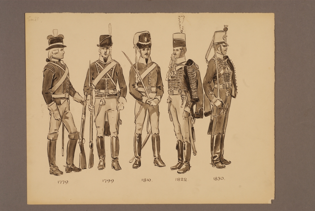 Plansch med uniform för Smålands husarregemente för åren 1779-1850, ritad av Einar von Strokirch.