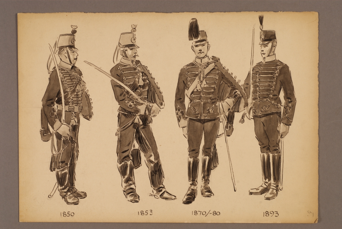 Plansch med uniform för Smålands husarregemente för åren 1850-1893, ritad av Einar von Strokirch.