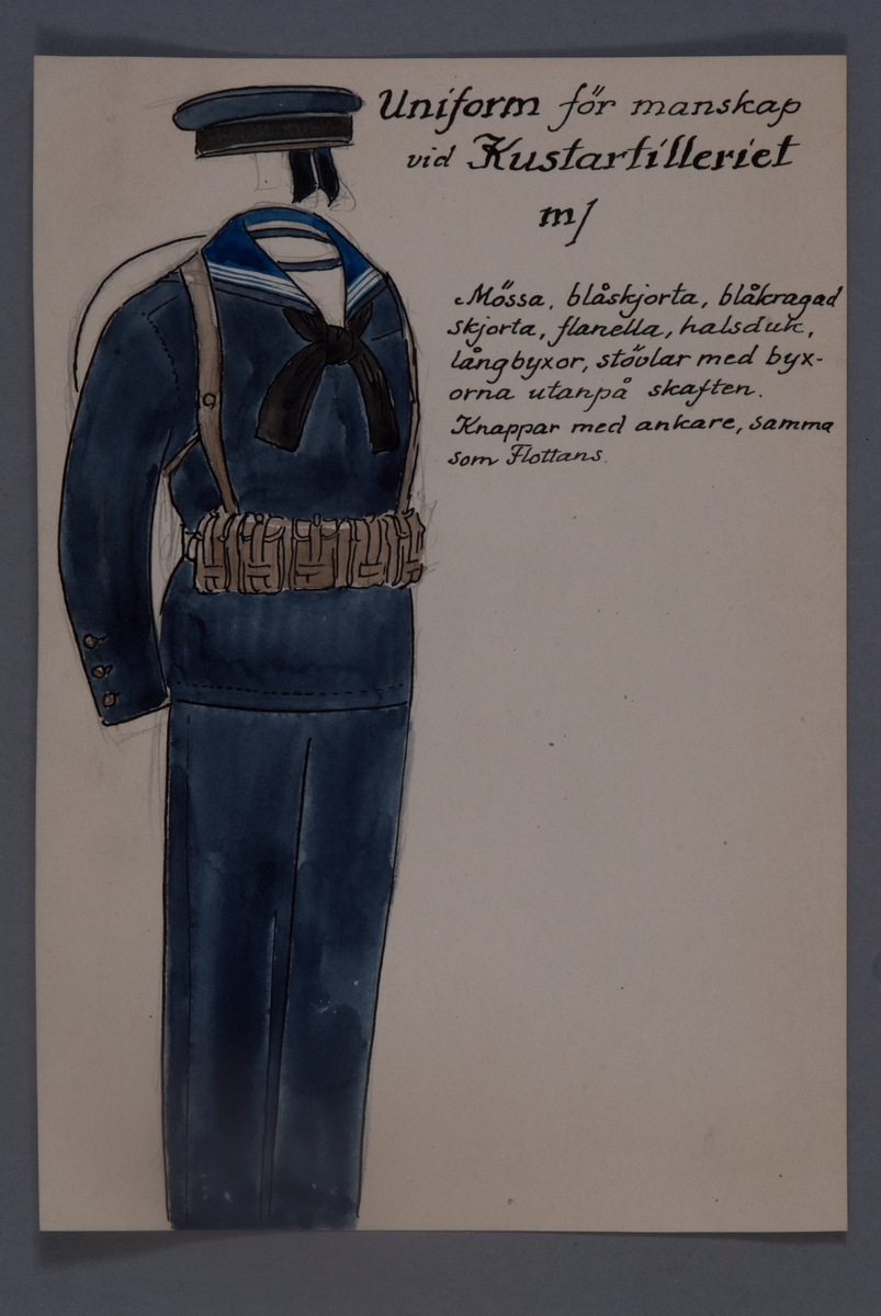 Uniformsteckning i original av Einar von Strokirch, för manskap vid Kustartilleriet.