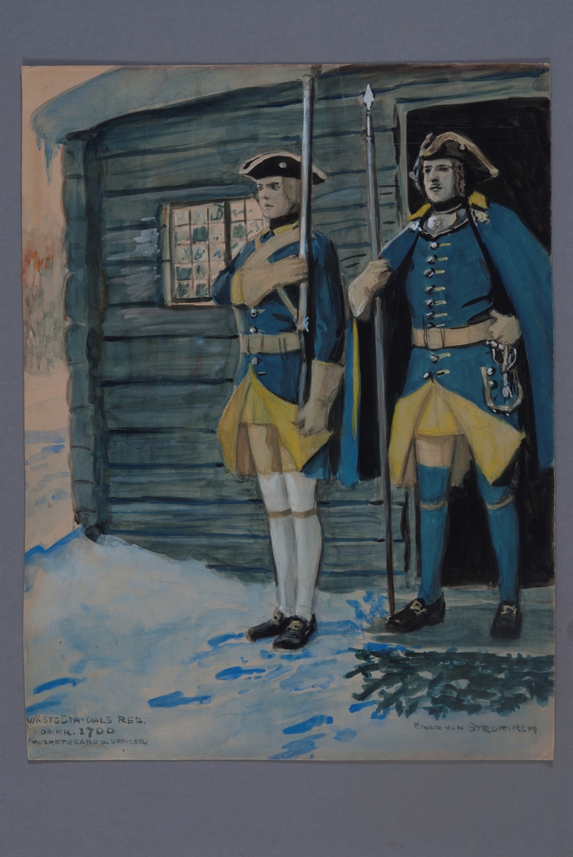 Plansch med uniform för musketerare och officer vid Västgöta-Dals regemente omkring år 1806, ritad av Einar von Strokrich.