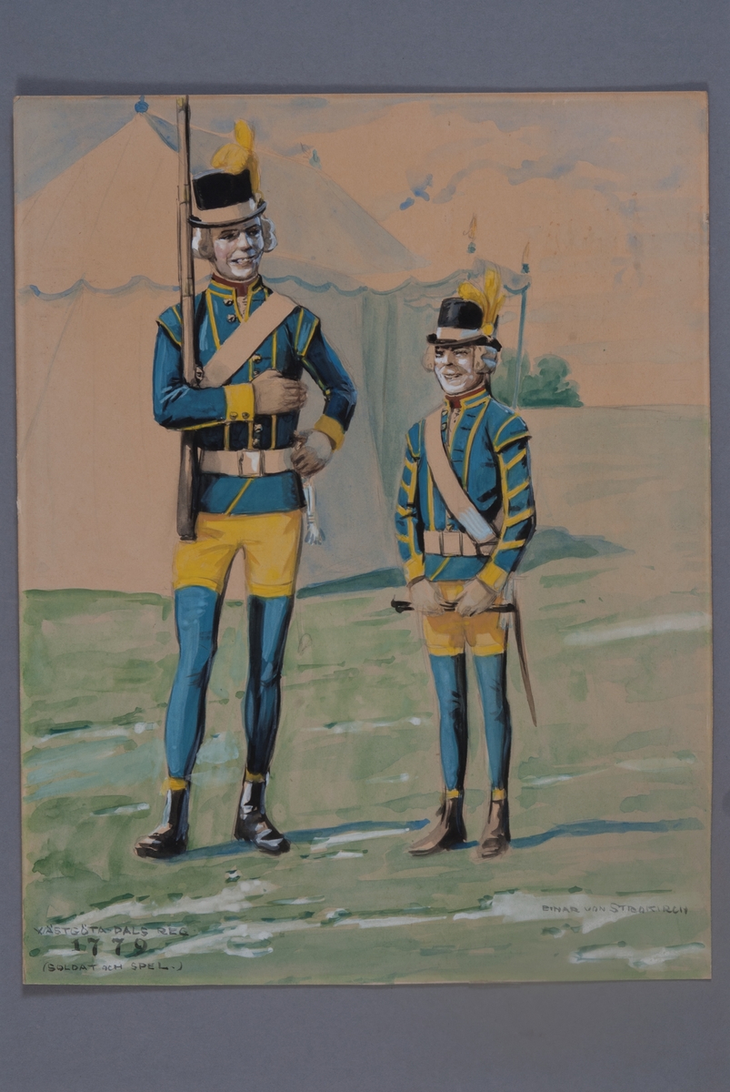 Plansch med uniform för soldat och spel vid Västgöta-Dals regemente för år 1779, ritad av Einar von Strokrich.