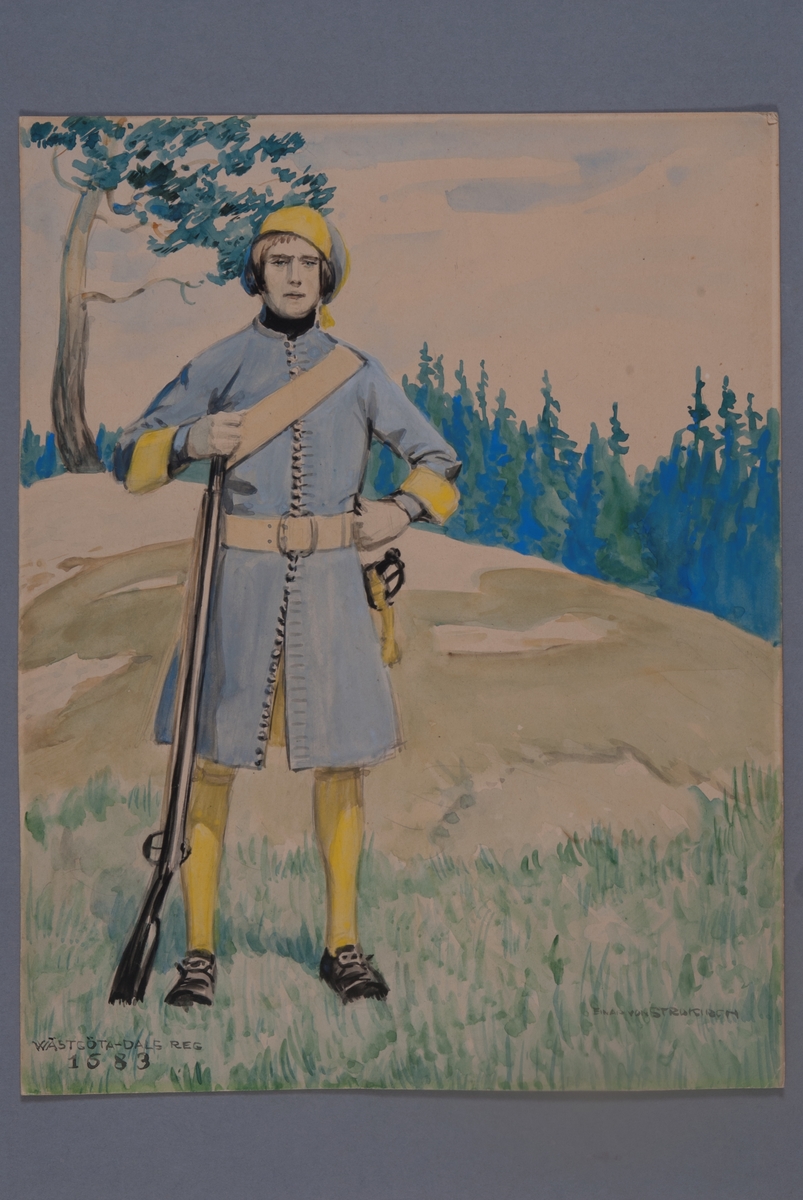 Plansch med uniform för Västgöta-Dals regemente för år 1683, ritad av Einar von Strokrich.