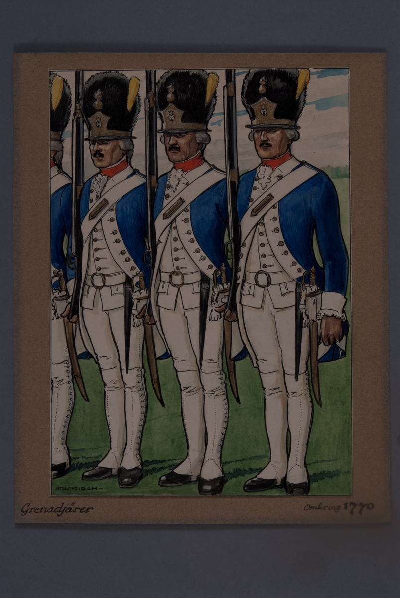 Plansch i original med uniform för grenadjärer omkring 1770, ritad av Einar von Strokirch.