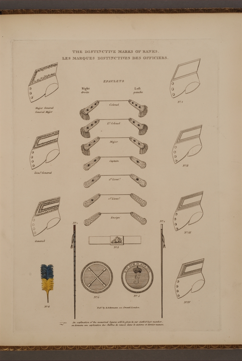 Plansch med gradbeteckningar för den svenska armén, ritad av Frederic Eben i boken The Swedish Army, utgiven 1808.