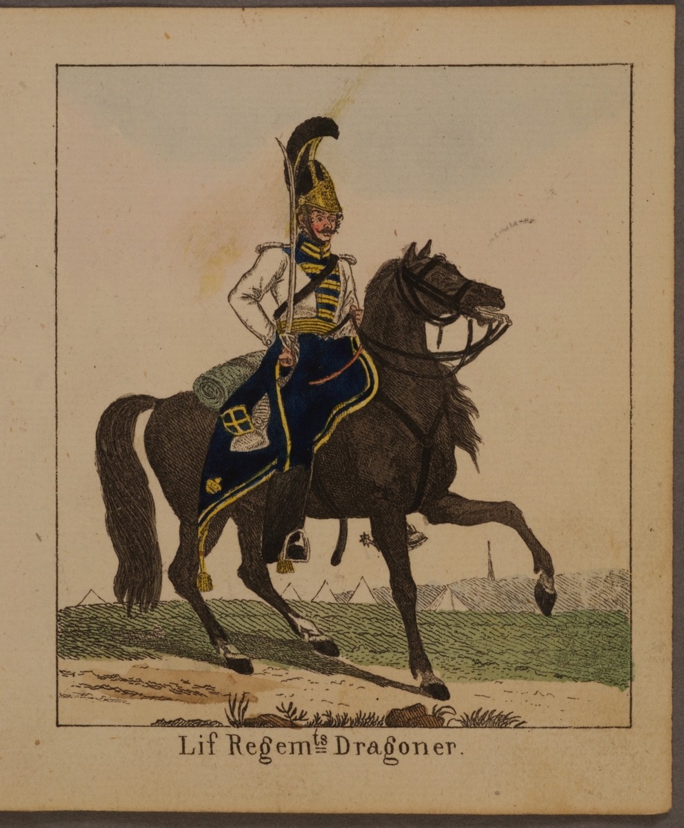 Miniatyrteckning med uniform för Livregementets dragoner. Färgtryck i boken Miniatur-teckningar af åtskilliga swenska militair-uniformer, utgiven av Carl Theodor Löwstädt på 1820-talet.