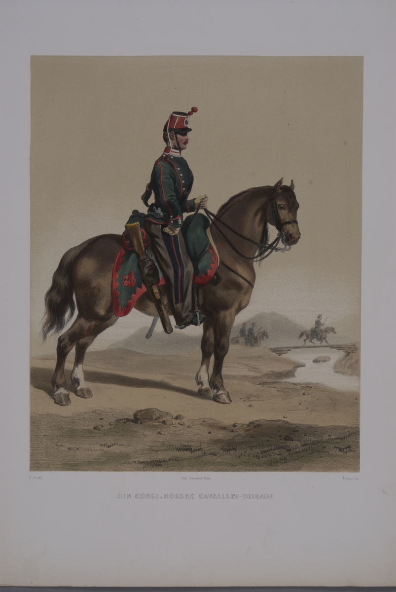 Plansch med uniform för Norska kavalleribrigaden. Plansch i färgtryck efter original av Fritz von Dardel. Ingår i planschsamlingen Den svenska och norske armeens uniformer, 1861-1863.