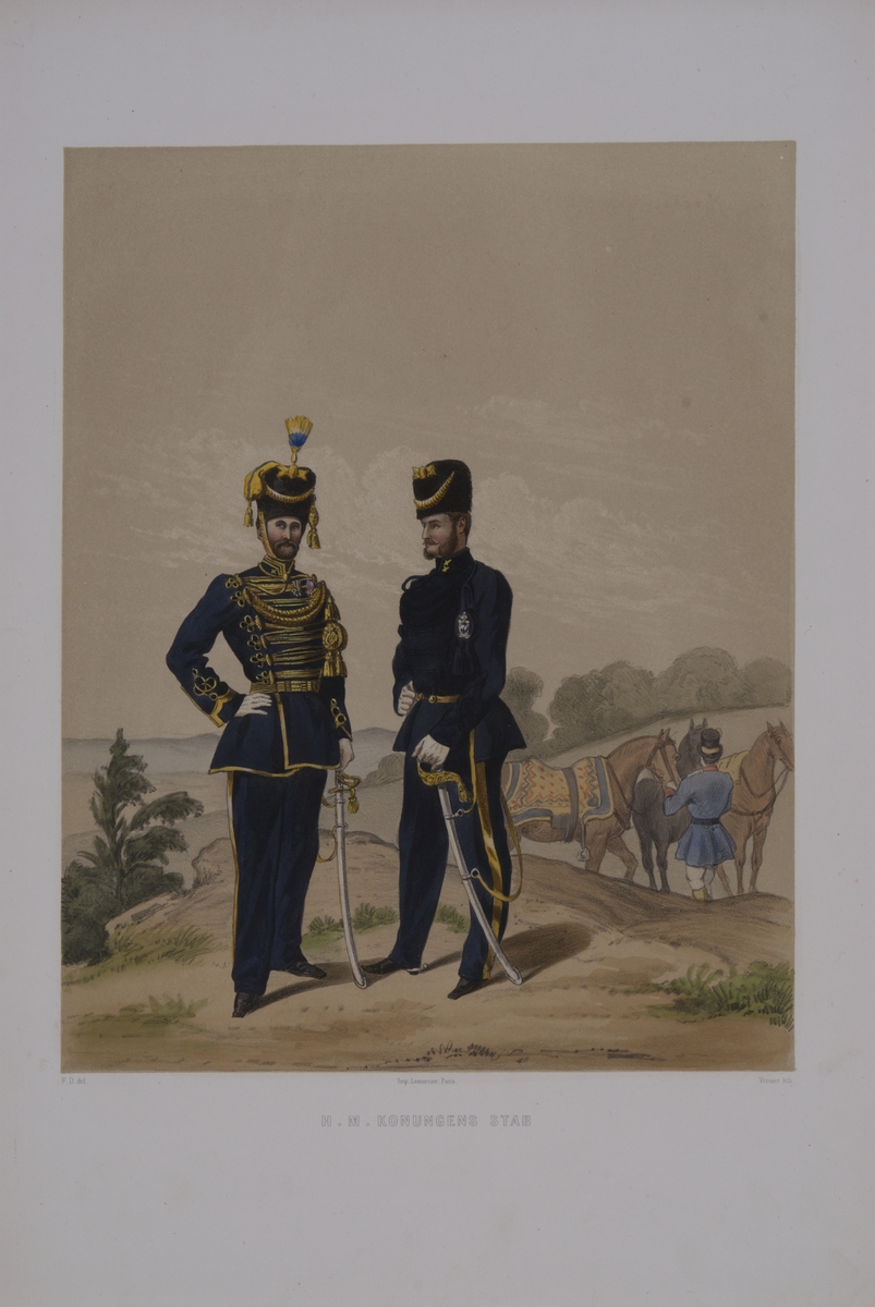 Plansch med uniform för Konungens stab. Plansch i färgtryck efter original av Fritz von Dardel. Ingår i planschsamlingen Den svenska och norske armeens uniformer, 1861-1863.