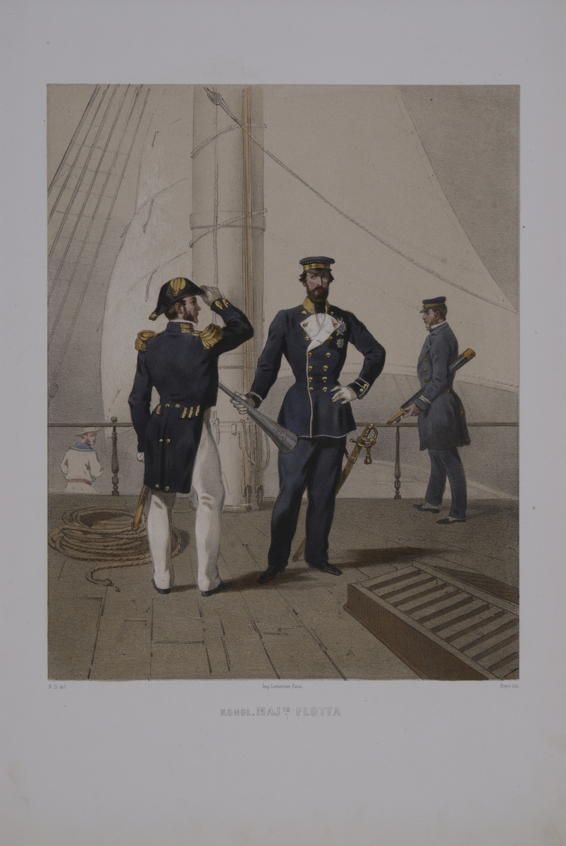 Plansch med uniform för Flottan. Plansch i färgtryck efter original av Fritz von Dardel. Ingår i planschsamlingen Den svenska och norske armeens uniformer, 1861-1863.
