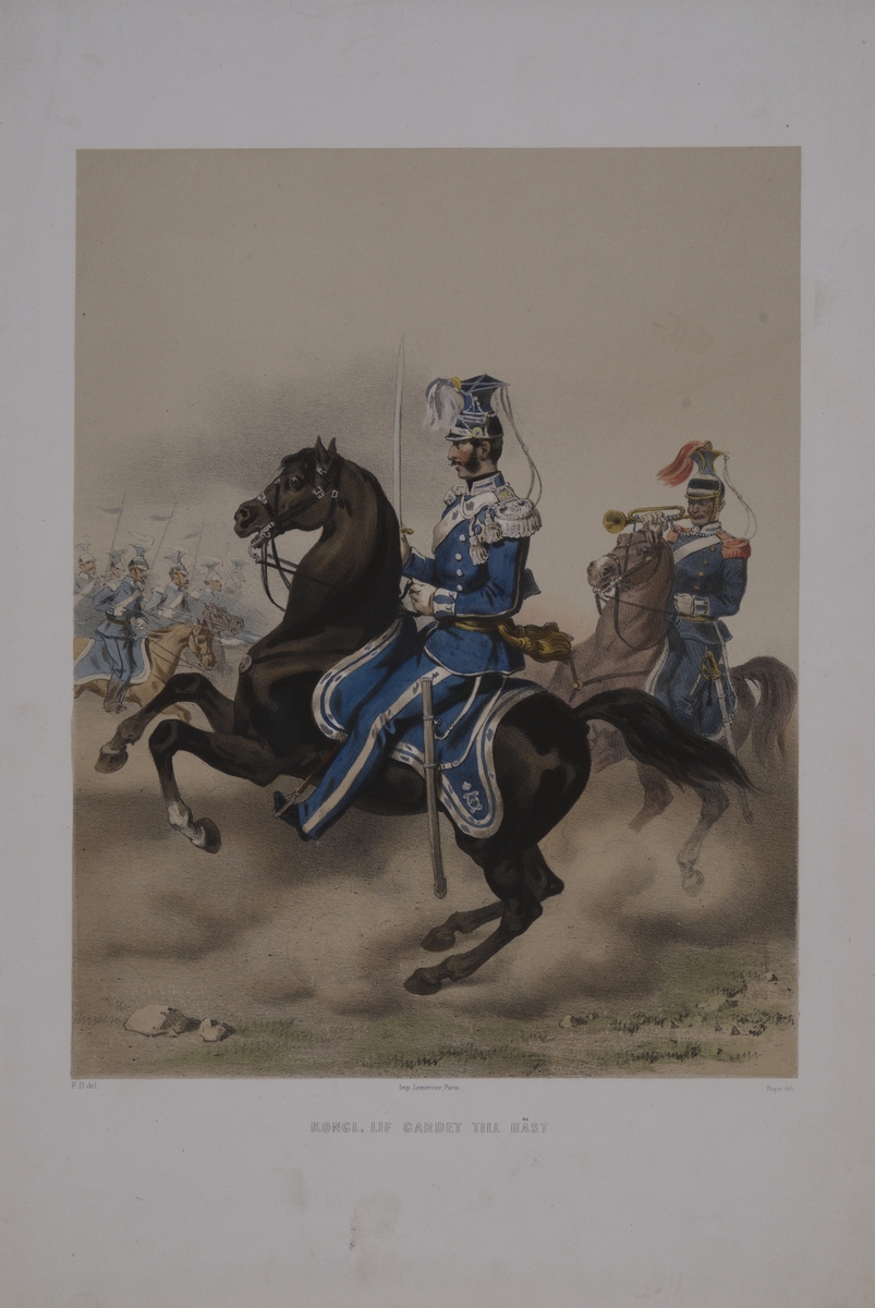 Plansch med uniform för Livgardet till häst. Plansch i färgtryck efter original av Fritz von Dardel. Ingår i planschsamlingen Den svenska och norske armeens uniformer, 1861-1863.