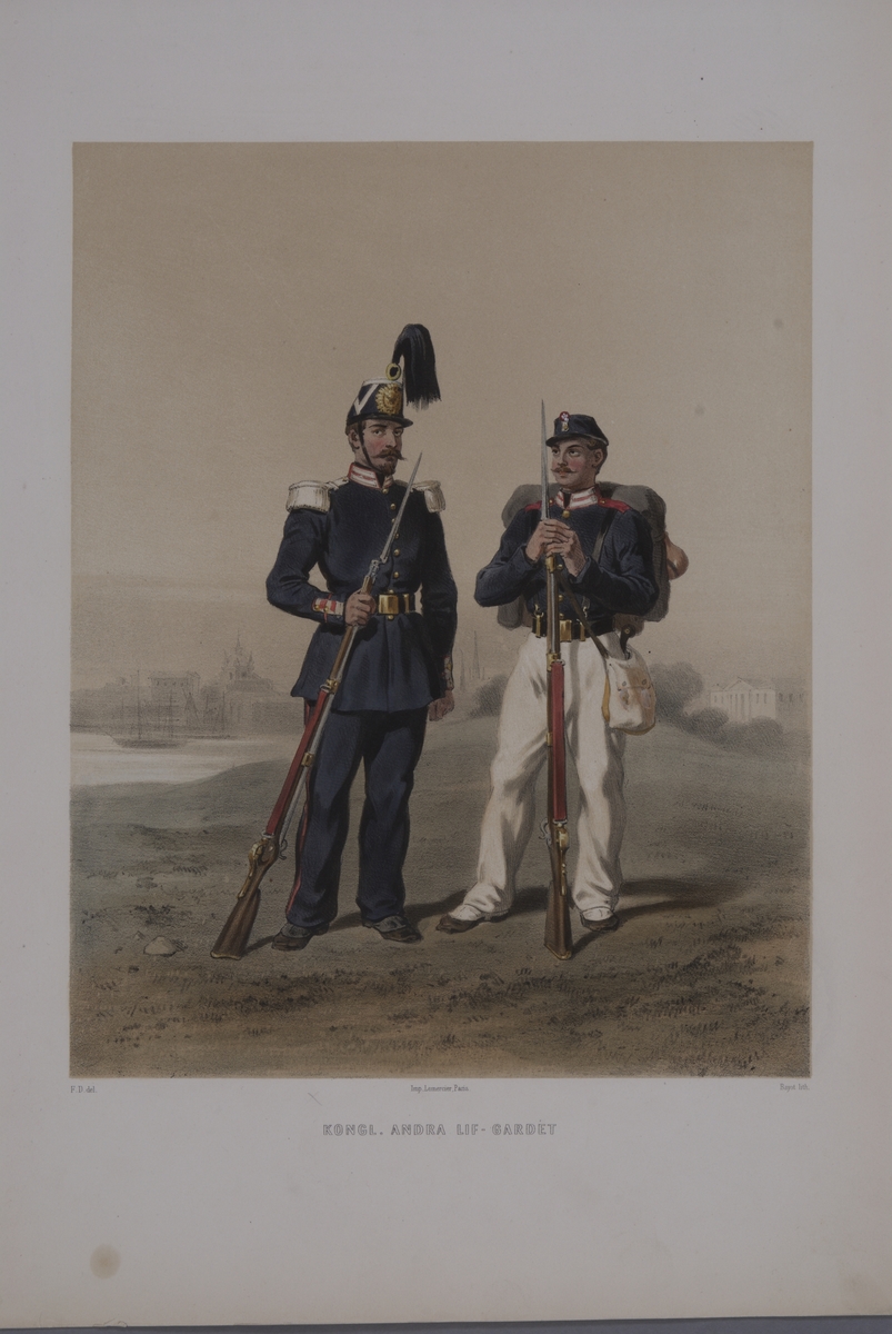 Plansch med uniform för Andra livgardet. Plansch i färgtryck efter original av Fritz von Dardel. Ingår i planschsamlingen Den svenska och norske armeens uniformer, 1861-1863.
