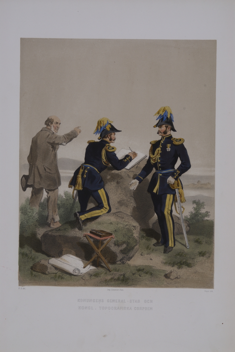Plansch med uniform för Generalstaben och Topografiska kåren. Plansch i färgtryck efter original av Fritz von Dardel. Ingår i planschsamlingen Den svenska och norske armeens uniformer, 1861-1863.