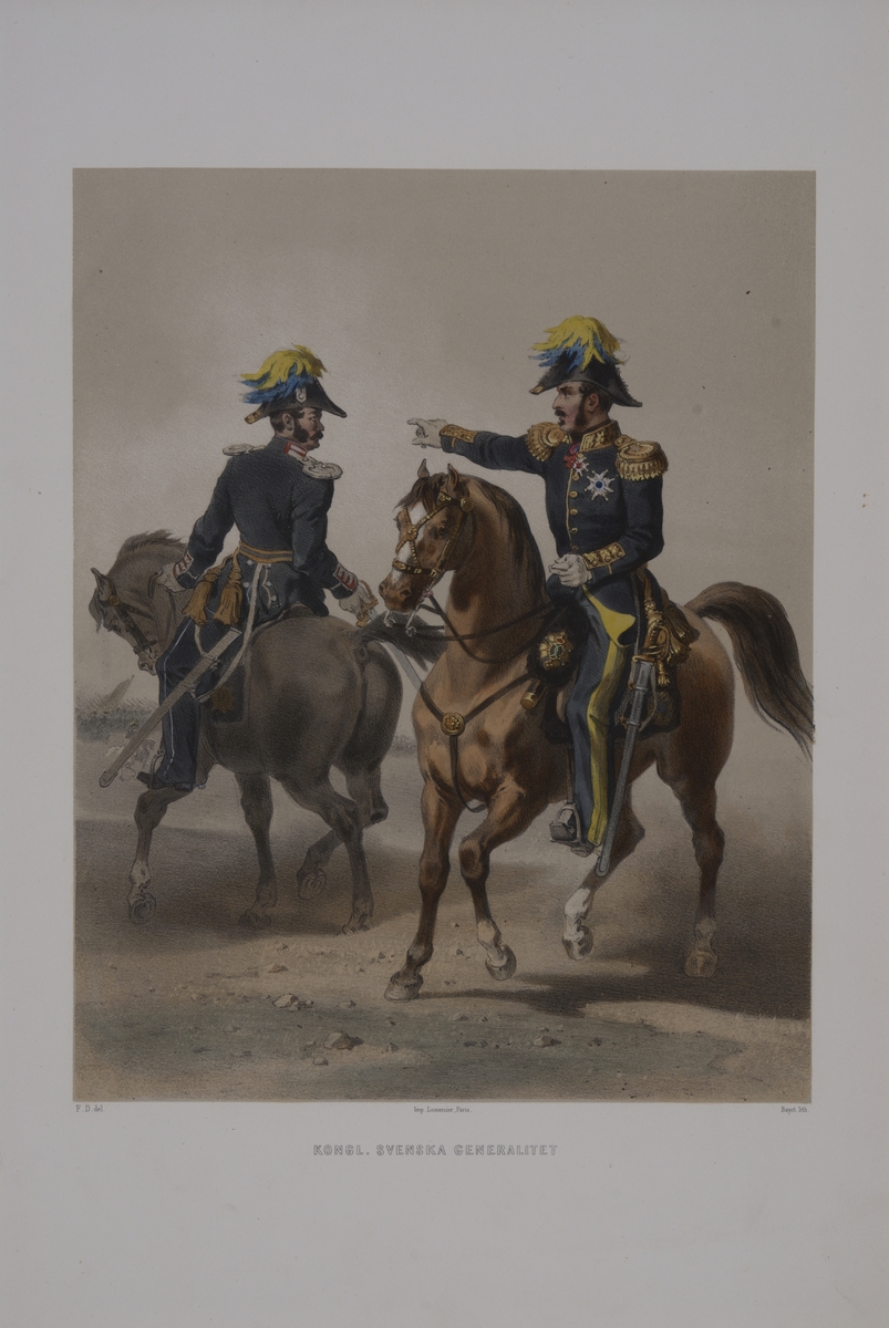 Plansch med uniform för Svenska Generalitet. Plansch i färgtryck efter original av Fritz von Dardel. Ingår i planschsamlingen Den svenska och norske armeens uniformer, 1861-1863.