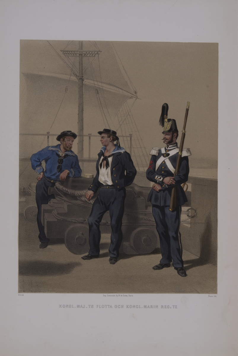 Plansch med uniform för Flottan och Marinregementet. Plansch i färgtryck efter original av Fritz von Dardel. Ingår i planschsamlingen Den svenska och norske armeens uniformer, 1861-1863.